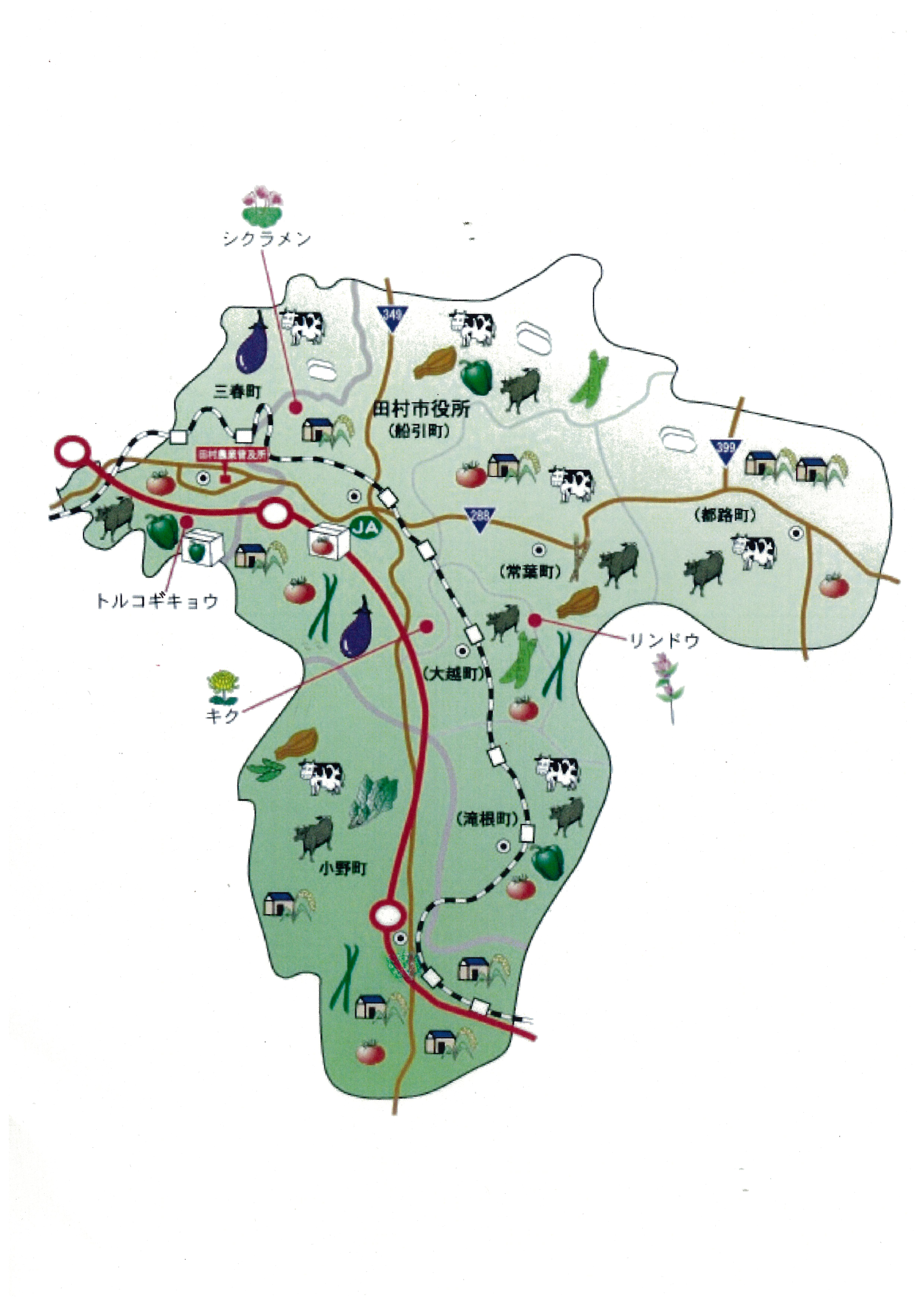 田村地域は、畑作物栽培の長い歴史があり、その技術力は高く、中山間地の特性を生かした生産が盛んです。近年、夏秋野菜や畜産の振興が図られ、県内でも優れた産地を形成しています。主な農産物には、畜産、野菜、水稲、葉たばこ等で、園芸品目の中では、ピーマン、トマト、さやいんげんなどが主に生産されています。