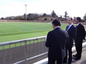 内堀知事が楢葉町を訪問し、人工芝や夜間照明、シャワーなどのクラブハウスを完備することにより、サッカーやラグビー競技など多目的に利用できる施設に生まれ変わった総合グラウンド多目的運動場を視察しました。