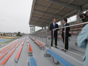内堀知事が鏡石町を訪問し、大規模改修が完了し、令和7年度にリニューアルオープン予定の「鏡石町営鳥見山陸上競技場」を視察しました。