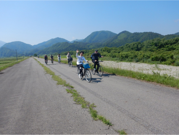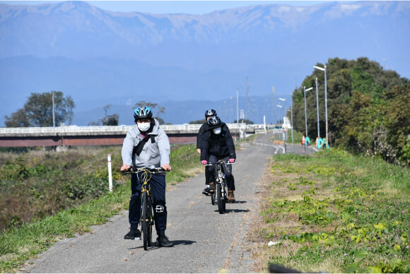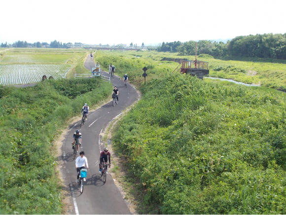 川沿いにあるため起伏が少なく、トイレが併設された休憩所が4カ所、道の駅が2カ所あり、初心者からファミリー層まで利用しやすいサイクリングロードです。四季折々の風景と、観光名所や旧跡が数多く点在しているのも魅力。始点と終点にはそれぞれの温泉の足湯があり、疲れた体を休めてくれます。