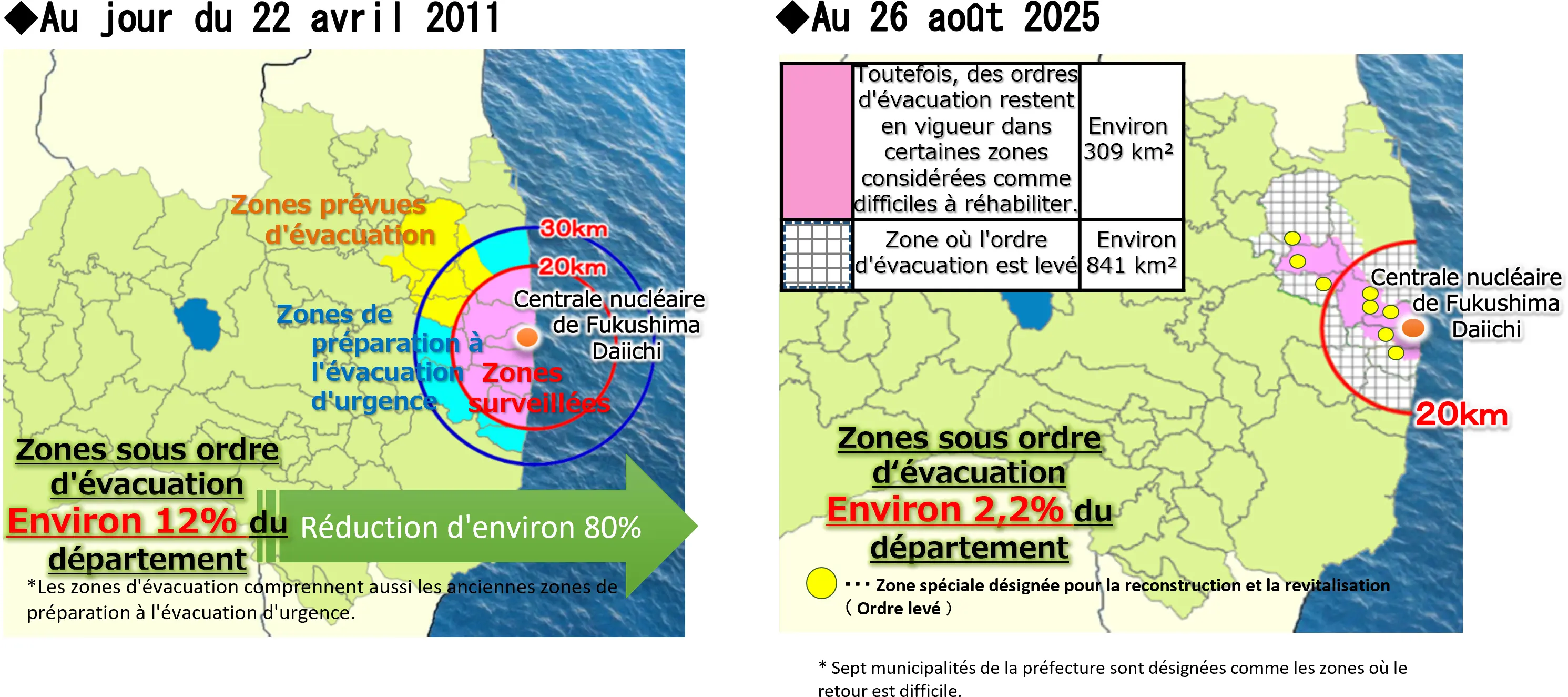 Entre juin 2022 et novembre 2023, les restrictions d'évacuation ont été levées dans toutes les zones désignées pour la reconstruction et la revitalisation spécifiques, couvrant six localités (Tomioka, Ōkuma, Futaba, Namie, Katsurao, et Iitate).