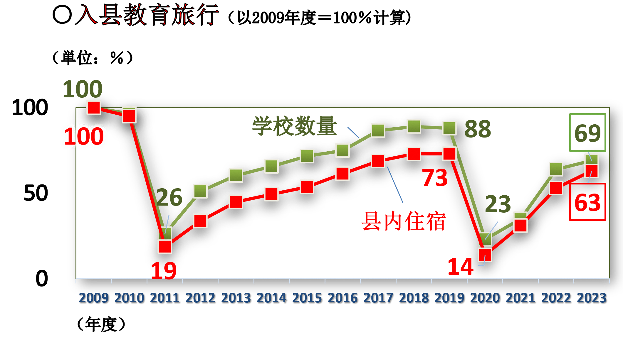 - 地震后教育旅行的接待人数大幅下降,但到2019年度已有所恢复。此后,接待人数虽因新冠疫情的影响而跌落至地震刚发生后的水准,但2023年度再度呈现回升趋势