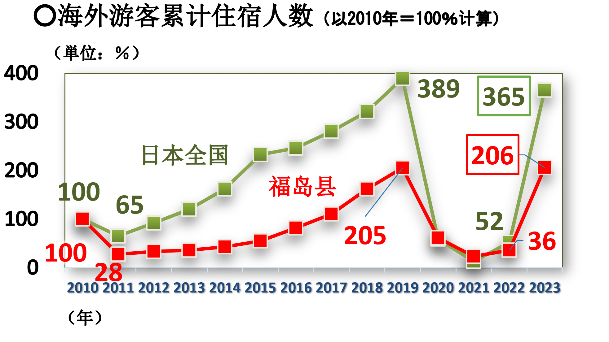 - 受地震、核泄漏及负面评价等影响,福岛县的游客人次(留宿客及当天往返游客的总和)遭受了重大打击。尽管造访福岛县的游客人次正在逐渐回复,但至今仍低于日本“3·11”大地震发生前的水平