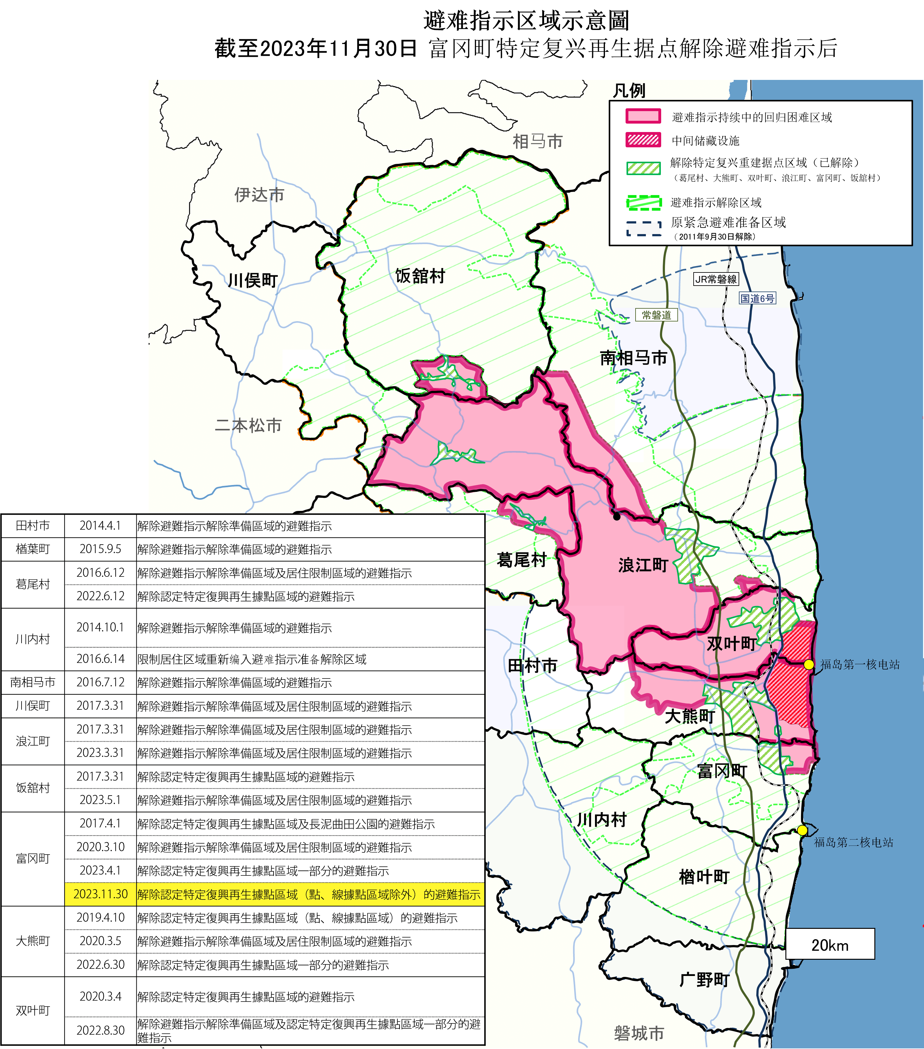 警戒區域富岡町、大熊町、雙葉町的全域;田村市、南相馬市、楢葉町、川內村、浪江町、葛尾村的一部分 計畫性避難區域浪江町、葛尾村除了警戒區域之外的區域;飯舘村全域;南相馬市除了警戒區域以外的一部分;川俁町的一部分 緊急時避難準備區域廣野町、楢葉町、川內村、田村市和南相馬市的一部分之中,在福島第一核電廠半徑20km範圍外的地區 2011年9月30日解除 (「避難指示區域有了什麼變化?」之三)此外,除了「警戒區域」和「計畫性避難區域」之外,還有因風向和地形而預測在事故後1年的累積劑量會到達20mSv以上的地區(熱點),這樣的區域是「特定建議避難地點」。政府會催促避難。(2014年12月28日全面解除) 之後,因為反應爐的狀況和輻射劑量調查結果確認安全,便決定居民生活環境的恢復目標(恢復計畫),解除了「緊急時避難準備區域」。(2011年9月30日) 避難區域的狀況(2011年9月30日)