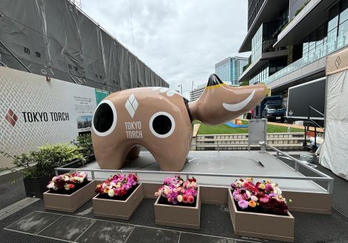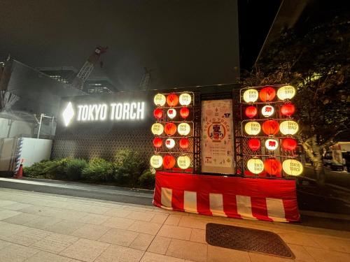 TOKYO TORCH Park 提灯オブジェ                 福島県産花卉(ダリア)により装飾された巨大赤べこ