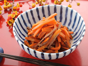 いかにんじん(福島市) 【味付けも材料もシンプルな元祖スローフード】福島県北部に江戸時代末期※1から伝わる「いかにんじん」は、するめいかと人参の千切りを酒・醤油・みりん等で味付けしただけのシンプルな和え物です。大量に作れて保存がきくため、正月料理の箸休めとして、祝祭時の酒のつまみとして地域で長く愛されてきました。最低限の調味料でつくる郷土料理で、水分が抜けてするめいかの旨みが染みたパリパリした人参の食味食感は癖になる味です。現在では福島県全域で一年中食べられており、各家庭でこだわりや工夫のある「おふくろの味」の象徴として親から子へ引き継がれています。近年ではポテトチップスなどの加工食品や、レシピサイトでのアレンジ料理、特に炊飯器に入れて炊くだけの「いかにんじん炊き込みご飯」はSNSで口コミが広まるなど、汎用性の高い味付き食材としても注目を集めています。※1「食」ふくしま新ふーど記(福島民友新聞社発行)を参照 |
