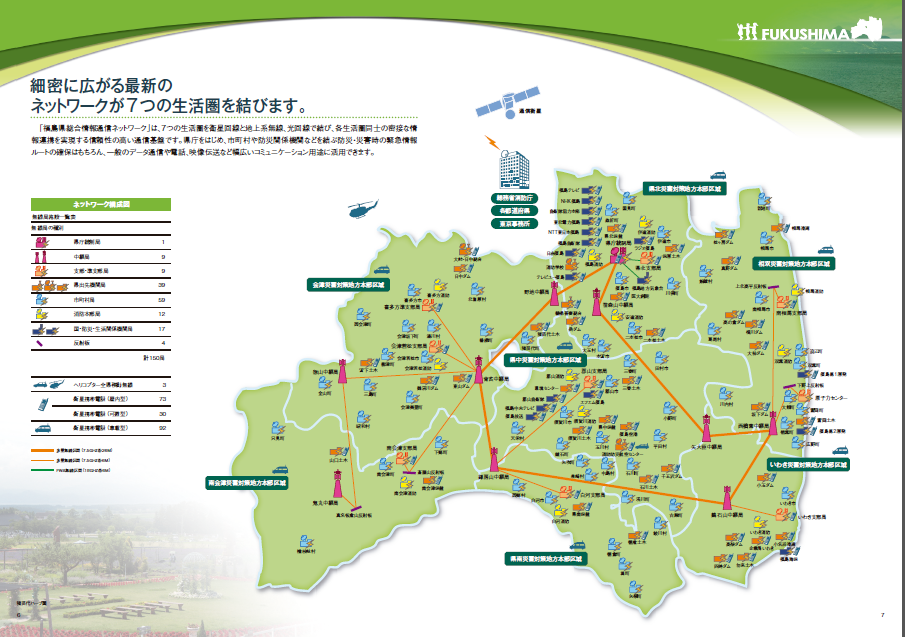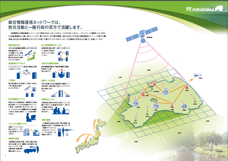 「福島県総合情報通信ネットワーク」は、災害から県民の生命、財産を守り、被害を最小限に抑えるため、国、県、市町村、消防、防災関係機関等に整備された通信網です。