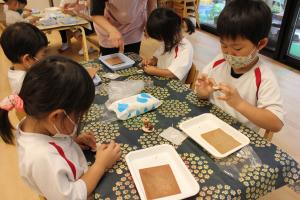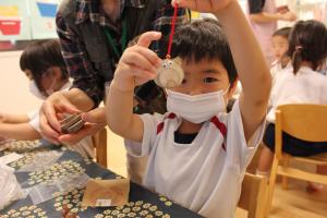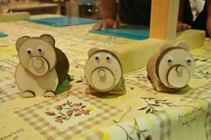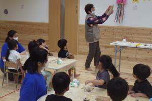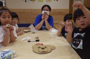 次の12園には、森林の役割や大切さを伝えるボランティアである「もりの案内人」を派遣し、もりの案内人と一緒に、間伐材や木の実などを使った工作を行いました。
