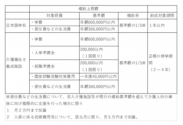 受入施設が実施する候補者の日本語習得状況に応じた日本語学習に必要な経費(日本語講師の派遣に要する経費、日本語学校利用時の受講料等)や介護分野の専門学習の費用(民間業者が実施する模擬試験や介護技術講習会への参加費用等)を助成する。