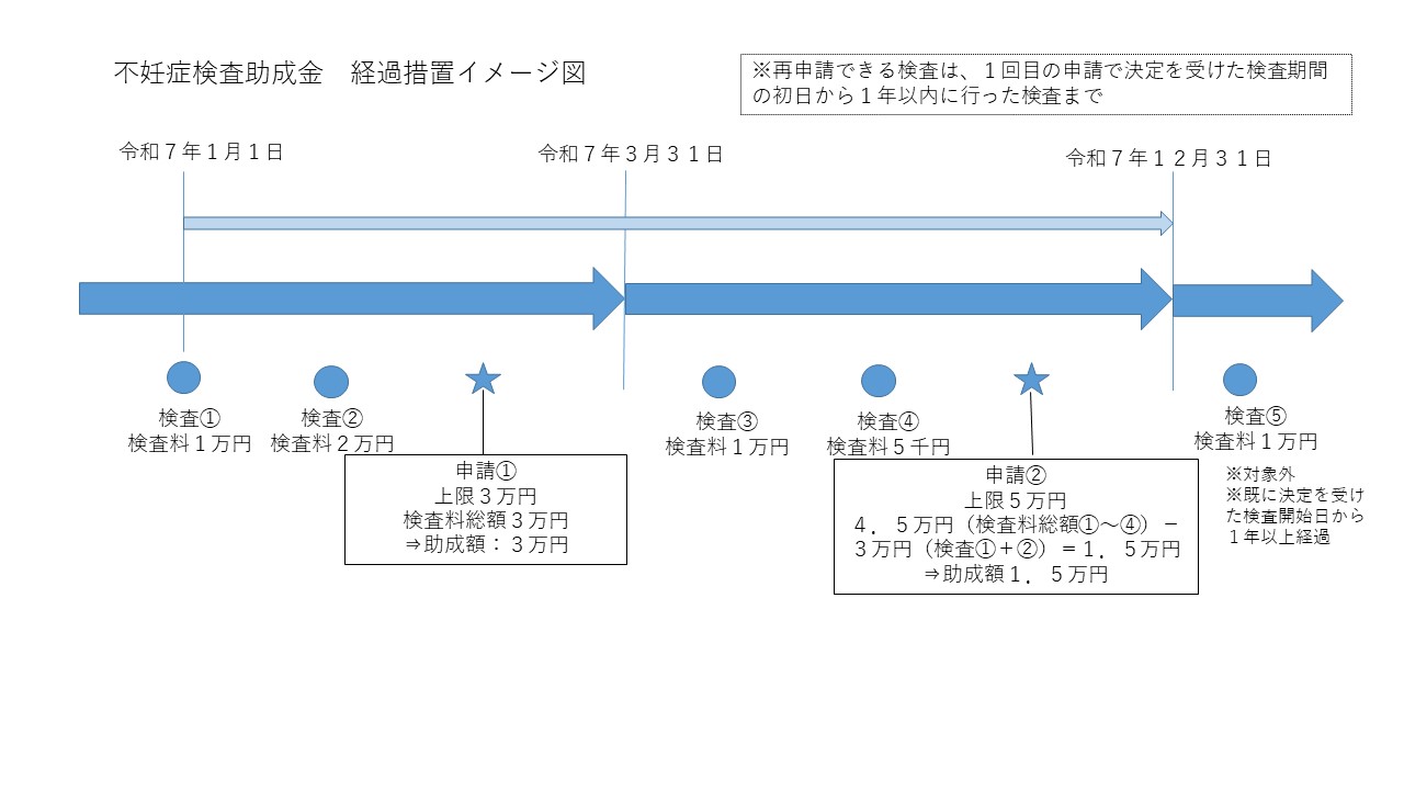 ・令和6年度中に申請を行った夫婦において、検査が継続していた場合に、1回に限り再申請を認めます。