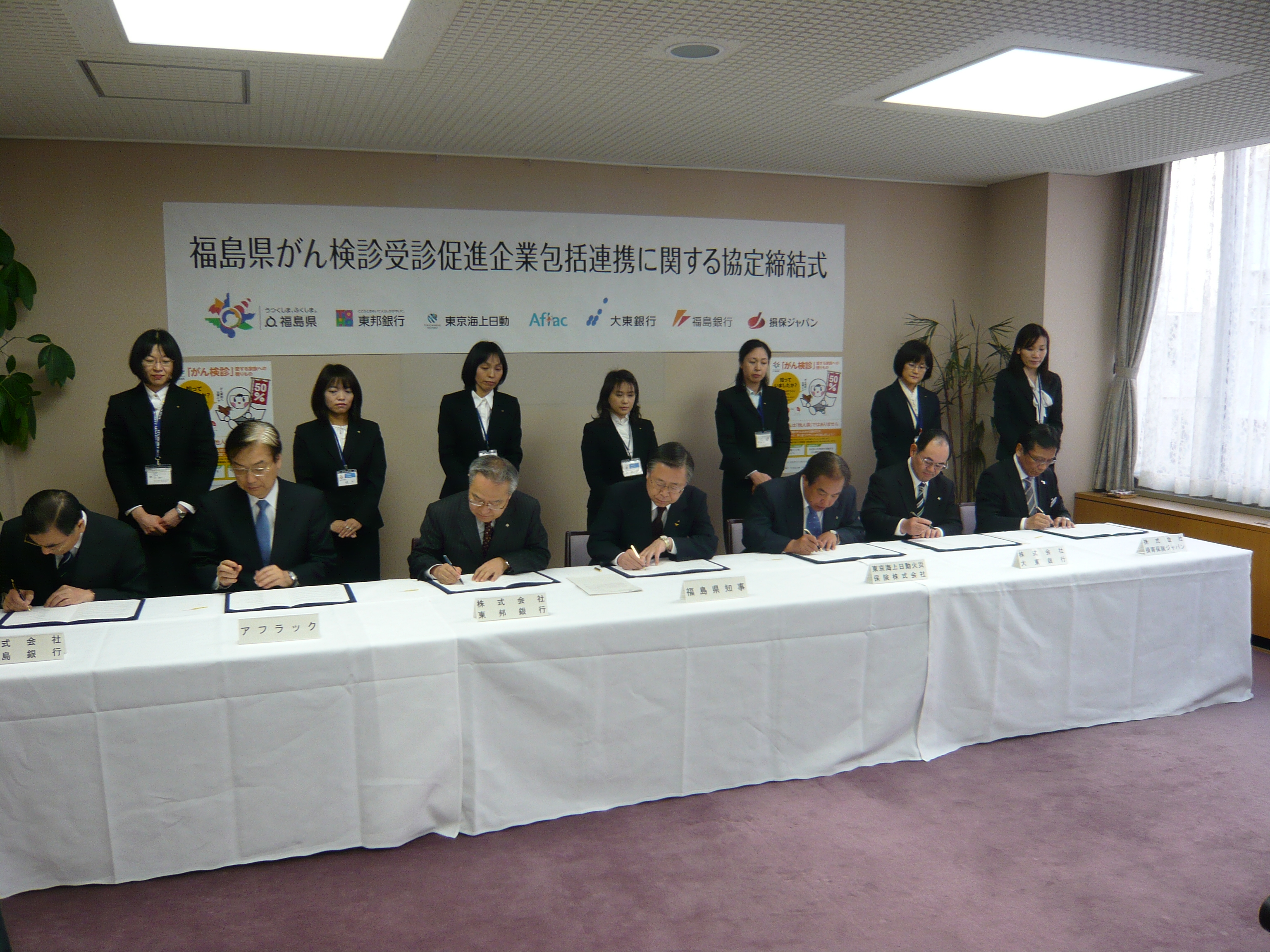 福島県では、平成20年3月に策定した「福島県がん対策推進計画」に掲げる、がん検診受診率向上とがんの早期発見・早期治療の推進に向け、県内の金融機関及び保険会社と連携し、がん検診の受診促進に関する活動を行うための、協定の締結式を下記のとおり行いました。