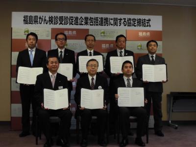 福島県では、平成25年3月に策定した「福島県がん対策推進計画」に掲げる、がん検診の受診率向上とがんの早期発見の推進に向け、新たに7企業と連携し、がん検診の受診促進等に関する活動を行うため、包括連携協定の締結式を下記のとおり行いました。