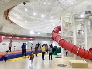 - 大型ネット遊具、大型すべり台、ランニングサークル、クライミングウォール、屋内砂場、床下迷路、エアトラック、