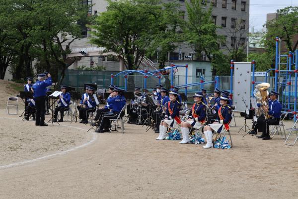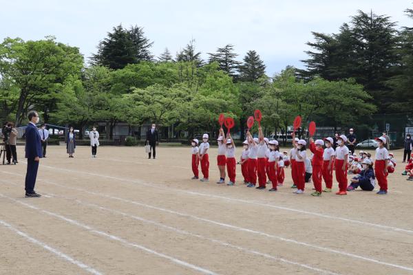 式典には、福島第一小学校の児童89名、保育所けやきの子の園児14名と県警音楽隊が参加し、全員で“こいのぼり“の歌を合唱する中、知事、こども未来局長、代表児童・園児6名で、こいのぼりを掲揚しました。