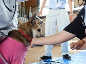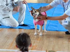| 授業が始まりました。 ハピまるの獣医師から、犬とのふれ合い方について説明し、実際にやってもらいました。 |