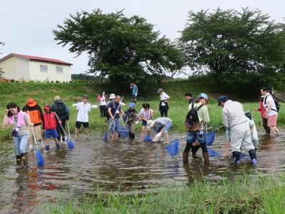 一般参加親子8名と水生生物調査の指導者を目指す受講生8名の計16名で実践編を開催しました。逢瀬川のきれいな水にふれながら、受講生を中心に川底の石裏などに生息する水生生物の採集を行いました。小雨ではありましたが、水生生物調査を楽しんでいただけたようでした。