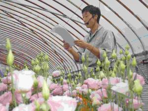 美しく高貴に咲き誇るトルコギキョウ 周年出荷に向けて、意欲を見せる参加者 リンドウの実証栽培について説明する