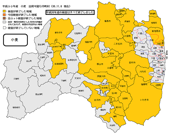 色塗りされた市町村等は、30年産の穀類(大豆、夏そば、秋そば及び小麦)で検査結果を公表しています。