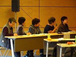 ○事例報告の様子 モデル地区から5名のお母さん達に企業を受け入れた感想や今後の目標をお話しいただきました。IT企業のような、あまり関係を持てなかった会社の方に来ていただき楽しかった。などの感想がありました。 |