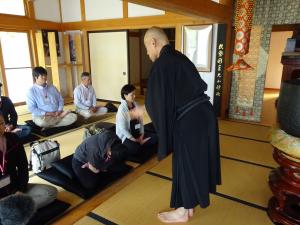 ○高乾院での 禅宗により、警策(左写真)の方法が違うことなど、座禅の方法等の教示を受けた後、座禅と写経の体験に真剣に取り組まれていました。 | |