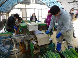 2カ所に分かれて、農業体験(ネギの収穫・調整体験、カボチャ栽培の後片付け、トマト収穫)を実施