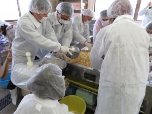 ○味噌造り体験 個々に役割の割り当てを行いませんでしたが、自然に役割が分担でき、スムーズに味噌造りができていました。 ○昼食 味噌を使った料理の昼食 | |