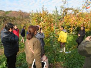 | ○地域資源調査 地域の施設見学や果樹園(左写真)において、園主のリンゴ栽培の考え、美味しいリンゴの選び方などの説明の後、リンゴの収穫体験などを行いました。 園主の熱心な説明を参加者や興味深く聞き入っておられました。 | |