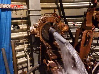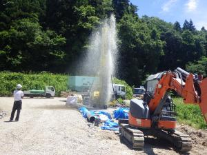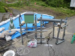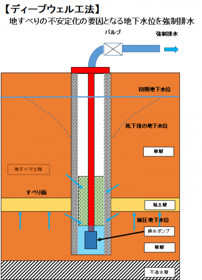 地すべりブロックの移動速度が大きく地すべりブロック内での調査すら危険で出来ない状況であることから、地すべり活動を抑えるため地すべりブロック外に緊急的な対策としてディープウェルを設置し、ポンプによる地下水の強制排水に着手した結果、すべり土塊の移動は早期の沈静化に繋がった。