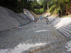 また、地すべりブロック内の表面水の地下浸透を防ぐための沢切り替え工事及び地すべりブロック内に流入していた排水路切り替え工事を行った。