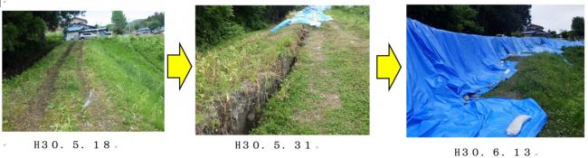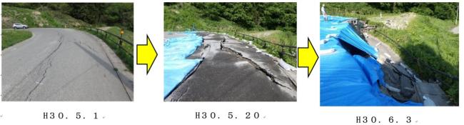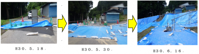 その後も、現場周辺の地すべり挙動は非常に激しく、県道路面の亀裂が拡大し、住宅近くにも拡大しつつあることから、5月25日に喜多方市による現地災害対策本部を立ち上げ、5月29日に1世帯2人に対して、避難勧告を発令した。
