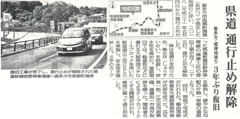 平成30年度5月4日から通行止めだった県道新郷荻野停車場線の復旧工事が完了し、令和3年9月25日に約3年4ヶ月ぶりの通行止め解除となった。