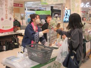 当日は令和5年7月に地理的表示(GI)保護制度に登録された昭和かすみ草を配布してPRを行ったほか、