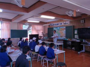 その後、学校給食の栄養士の先生から、地元の安全な食材を使用し、食品添加物の少ない調味料の使用や塩分の使用を最小限とした週5回の米飯給食の取り組みについて説明を受け、実際に試食をさせていただきました。