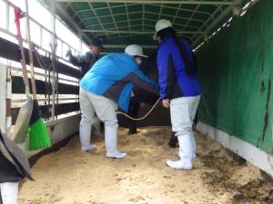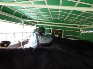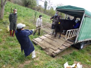それぞれの牛舎からトラックで運ばれた6頭の牛を荷台から下ろし、広々とした牧野に誘導しました。