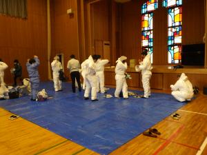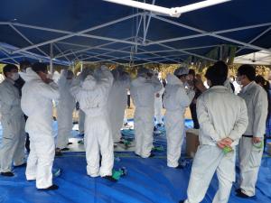 会津地方での鳥インフルエンザの発生を想定し、隣接する駐車場に鶏舍を想定したテントや鶏の殺処分時に着用する防護服の脱着所用テント等を設置し、防護服の着脱演習や殺処分に係る模擬演習、さらには車両の消毒の演習を行いました。