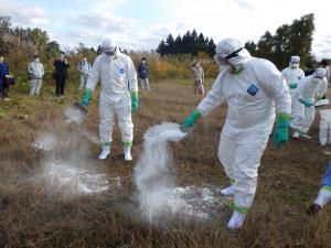 手袋、長靴への目張り 殺処分の模擬演習 傾斜を想定した場所へ石灰散布