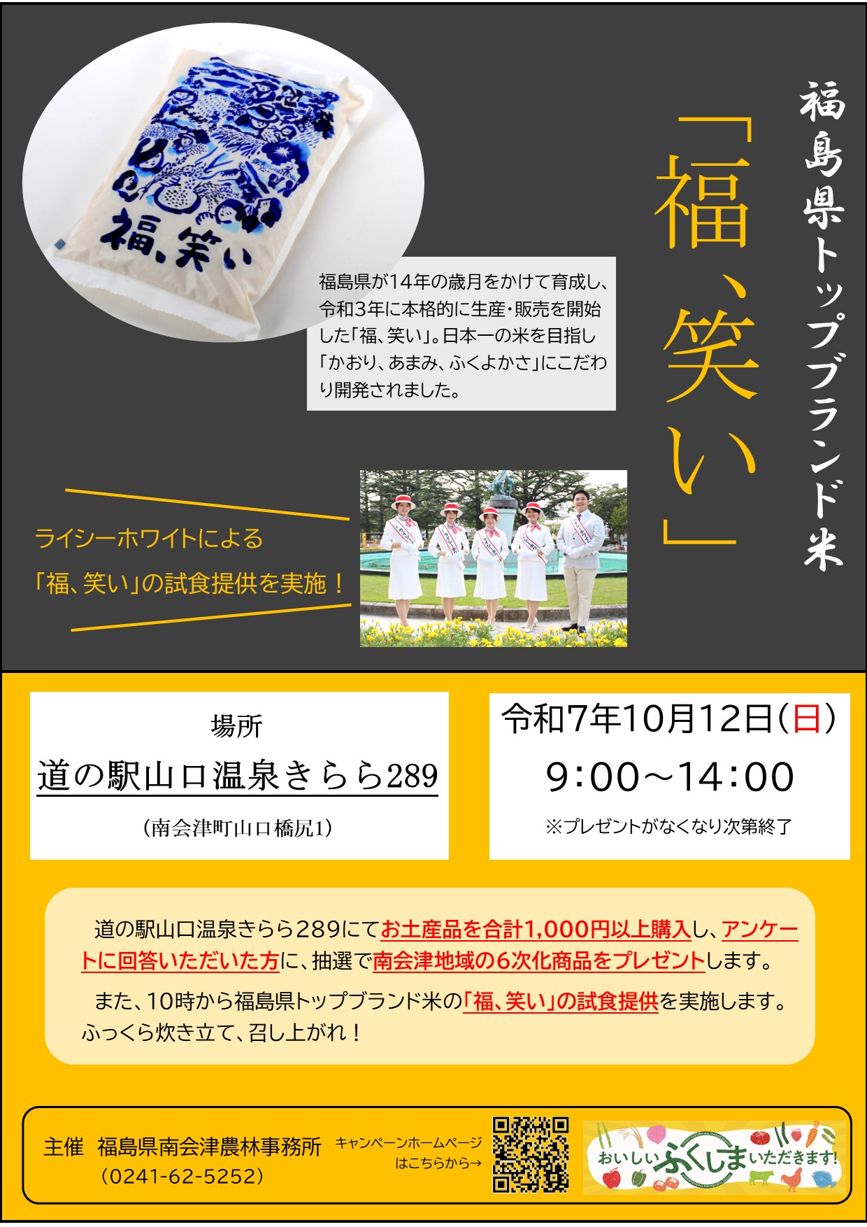 第5回「おいしい ふくしま いただきます!」キャンペーンは、道の駅山口温泉きらら289で、福島県トップブランド米「福、笑い」や南会津地域の6次化商品をPRしました。