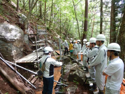 担当者等(現場監督員や現場代理人等)が各現場の特徴について説明後、施工状況を研修しました。参加者全員が初めて見る工法であることから、様々な疑問や質問が出されるなど活発な意見交換がなされ、「動いている」現場を見ることの大切さを改めて感じました。