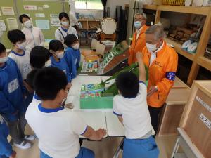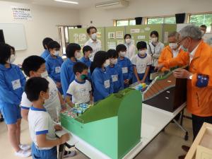 出前講座では、土石流等の災害からまちを守る施設および災害から身を守るために必要な備えについて学んでもらうために、土砂災害等が起こる仕組みや、砂防施設の実例および災害の予兆がわかるスライドと、土砂災害とその対策を再現した模型を用いて解説しました。また、令和元年度の台風19号による被災を受け、大雨や洪水への備えについても学んでもらうために、被災状況写真や降雨時の避難行動等についてスライドを用いて解説しました。