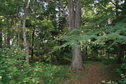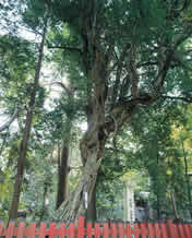 社叢 この林は神社の神域なのでみだりに入り草木を採ることを禁じられていた。そのため杉が植生されている他は、人の手が入らな い自然林が残されている。特に宮川に沿う社地の東側は自然度が高く巨木も多く残っている。