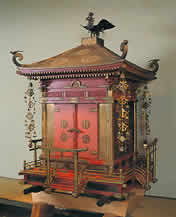 朱漆金銅装神輿 (しゅうるしこんどうそうみこし) この神輿は室町時代の作で、時代の特色を良く示している一品といわれるものである。社伝によると、大永六年(1526)に高田館主芦名盛安とその嫡子盛常により寄進された。総高113・6cm、心柱54 ・5cmで屋根は宝形造銅板張り、四隅の先を蕨の手のような形にしている。その最頂には金銅の燕の飾りがついている。三方の壁面は銅版で、金銅輪宝紋を打ち付けている。柱は金銅丸柱、正面の朱漆金銅扉に「竪二ツ引紋」と「左三ツ巴紋」を打ち、四方の階段下には鳥居を建てて、正面には扉を設けている。伊佐須美神社に伝わる数々の宝物は宝物殿に所蔵されている。(有料)