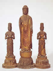 法幢寺の善光寺式阿弥陀三尊 法幢寺本堂 銅造阿弥陀如来及両脇侍立像 明応三年(一四九四)に開山された法幢寺(ほうどうじ)には国指定重文の「銅造阿弥陀如来及両脇侍立像」がある。これは鎌倉期の善光寺式阿弥陀像の中でも極めて優秀な作と認められたものである。中尊は四八・八センチで向かって右が勢至、左が観音であるが、配列が置き換えられているのは珍しい。横から見ると少し前方に傾いている。来迎型になっている姿は何ともいえない神々しさが漂う。境内には樹齢百年以上といわれる百日紅(さるすべり)の木がある。晩夏になるとやや紫じみた桃色の花はこの辺りでは最高にすばらしいものである。