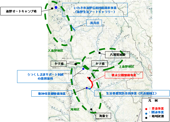 【現状】 遠野地区は、いわき市の南部に位置し、オートキャンプ場、鮫川、入遠野川、滝富士、龍神峡などの豊富な資源に恵まれ、また、紙すき、野鍛冶などの伝統を継承しようと体験施設である『遠野生活アートギャラリー』があります。