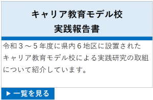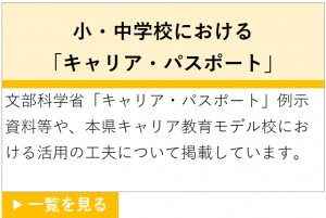| 令和3~5年度に県内6地区に設置されたキャリア教育モデル校による「キャリア・パスポート」の活用の取組について紹介しています。 | 福島県の小・中学校における「キャリア・パスポート」の作成及び活用について掲載しています。 | 文部科学省の「キャリア・パスポート」に関する資料等について、リンクしています。 |