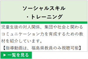 | 児童生徒の対人関係、集団や社会と関わるコミュニケーション力を育成するための教材を紹介しています。 | 各教材の研修動画を限定公開しています。 【福島県教員のみ視聴可能】 ・パスワードは、各学校への依頼文を参照ください。 |