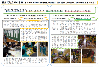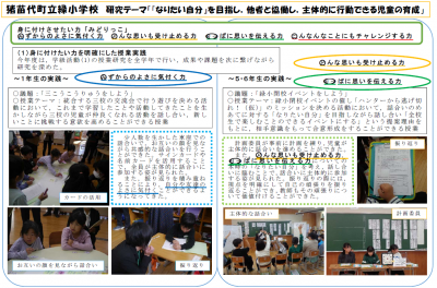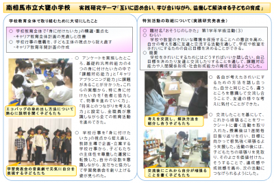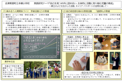 | 「自ら学び、表現する児童の育成~キャリア教育の視点を生かした授業 実践~ [PDFファイル] | 自己を見つめ共に認め合い、主体的に活動に取り組む児童の育成 [PDFファイル] | 夢や希望をもち、他者と関わり合いながら、自分らしさを伸ばそうとする子どもの育成 [PDFファイル] | |||||||||||||||||||||