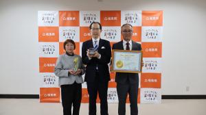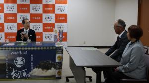 内堀知事は、おびすや(相馬市)が製造する「ピリカラ青のり佃煮」が、第85回ジャパン・フード・セレクションにおいて最高賞のグランプリ賞を受賞したことを報告するために来庁された、同社久田則雄代表、久田幸枝氏の表敬を受けました。