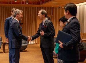 知事は、フレデリック10世国王陛下、同国閣僚らと懇談し、交流を深めました。続いて開催されたエネルギーセレモニーにおいて、在日デンマーク王国大使館、東京都、北海道及び本県のGX(グリーントランスフォーメーション)に関する連携に向けたクリーンエネルギー宣言に署名しました。