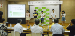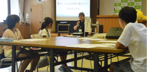8月1日、福島市において、「県庁に みんなの声を 届けよう!」プロジェクトを開催しました。県内の小学5・6年生21名が、パラリンピック競技種目であるボッチャを体験し、パラリンピアンの講話を聞きました。その後、「オリンピック・パラリンピックとふくしまの『スポーツ』・『おもてなし』・『バリアフリー』・『未来』」をテーマとした4グループに分かれ、活発に意見交換をしました。グループごとにまとめたアイデアや提言を、参加者全員が、内堀知事や鈴木教育長・教育委員の前で発表しました。少し緊張しているようにも見えましたが、みんな堂々とした発表で、テーマごとのアイデアあふれる様々な発想が県庁に届けられました。