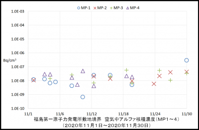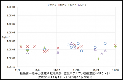 東京電力ホールディングス株式会社が福島第一原子力発電所の敷地境界にあるモニタリングポスト(MP-1~MP-8)近傍に設置されているダストモニタを用いて空気中の放射性物質濃度を24時間連続で測定しています。